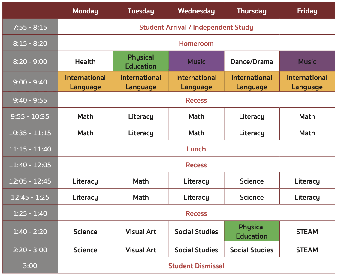 Our comprehensive Elementary Program is based on the Canadian (Ontario) curriculum and the student timetable includes the following subjects:
