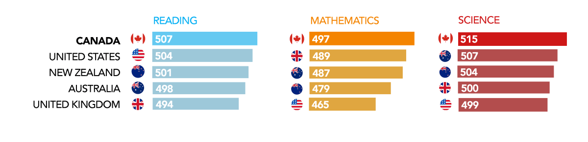 Canada has ranked the best among all the English-speaking countries for the past two decades in Literacy, Mathematics, and Science. As shown in the Programme for International Student Assessment (PISA) 2022 results. Canada outperformed other countries in Reading, Mathematics, and Science.